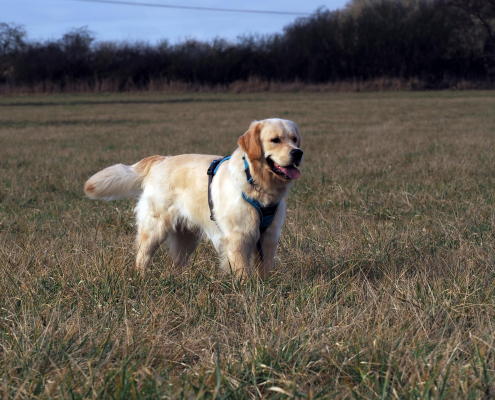 Bereits vor zwei Jahren hatten wir seine Schwester beim Wesenstest erleben dürfen. Da sie mir damals sehr gut gefiel, kam ich auf ihren Bruder. Gezogen in den Niederlanden lebt Imbir in Polen und hat bereits ein paar schöne Würfe gehabt. Nicht nur Stammbaum und Gesundheitswerte passen bei ihm, auch vom Aussehen und Wesen her entspricht Imbir meinen Vorstellungen eines typischen Golden.
